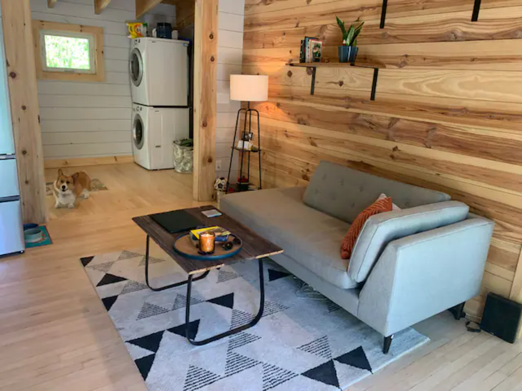 A two-bedroom cabin on six private acres near DuPont State Forest, about 15 minutes from Hendersonville and 17 minutes from Brevard. Rated 4.97 stars across 118 Airbnb reviews. Dogs welcome.