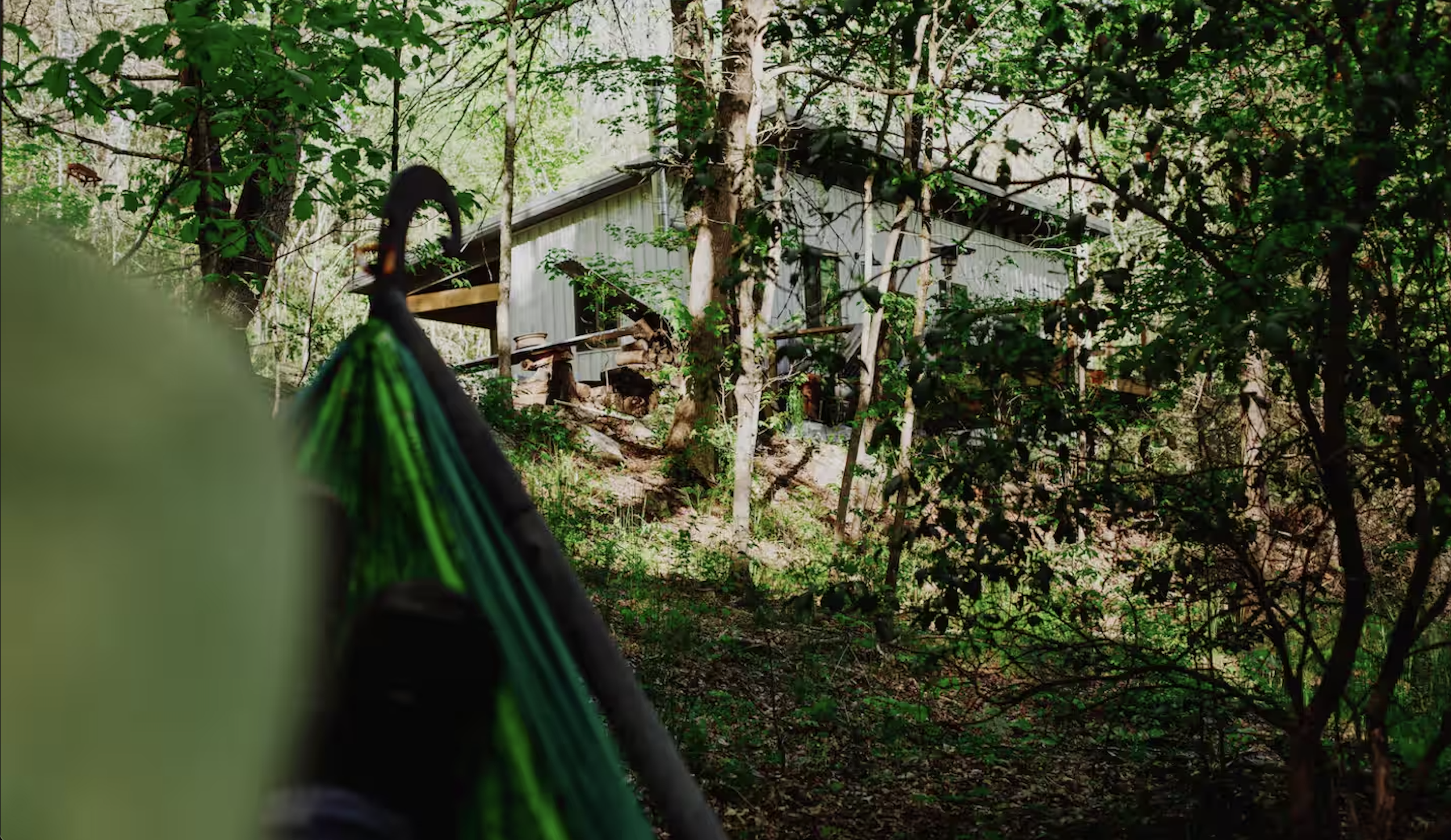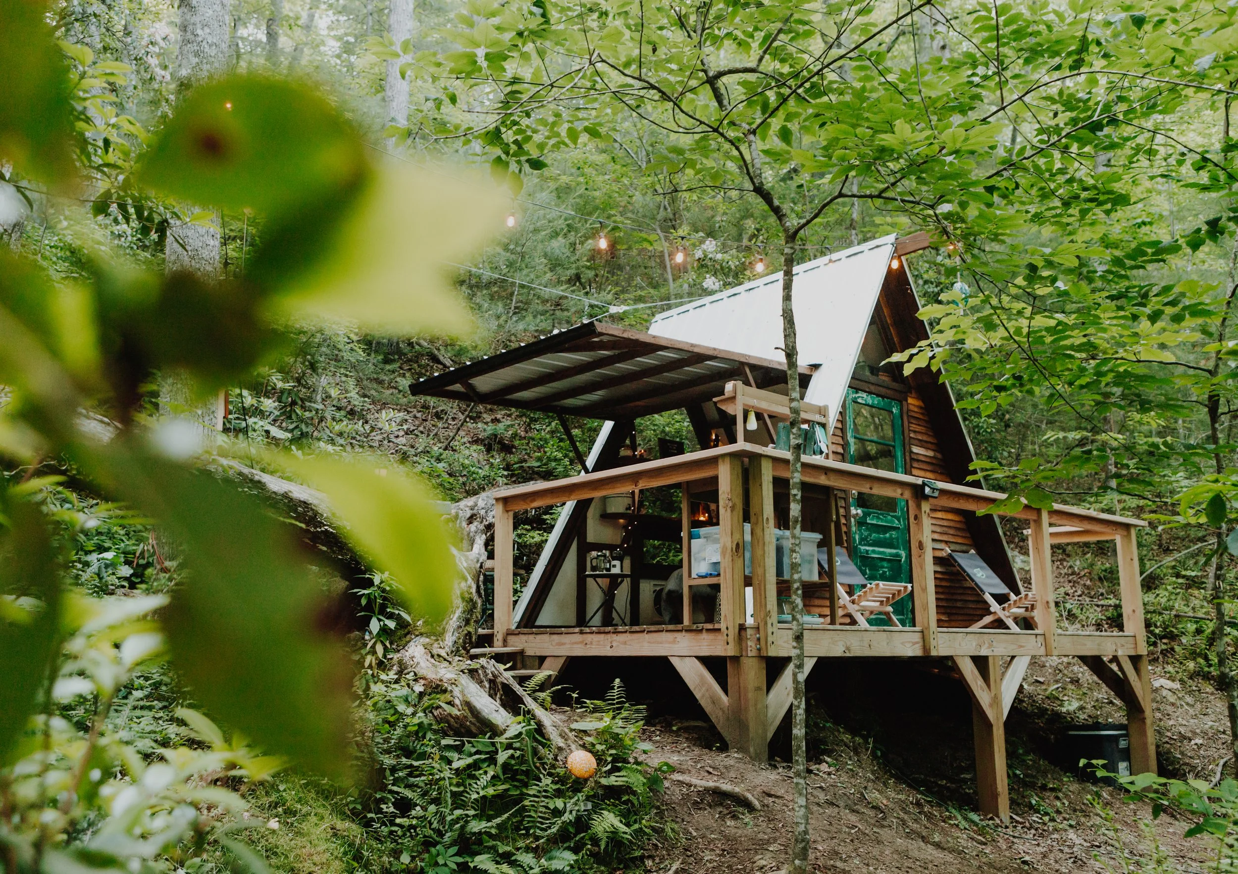 A hand-built A-frame cabin tucked into the hillside above a trickling creek, with a private fire pit, hammock area, and winter mountain views. Nero Coffee is always included. Pets welcome.